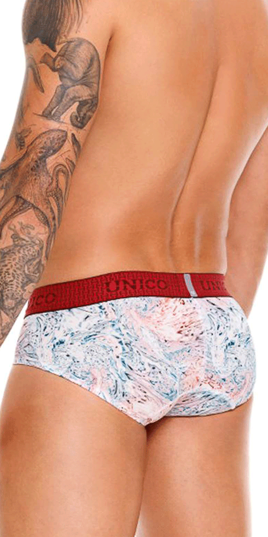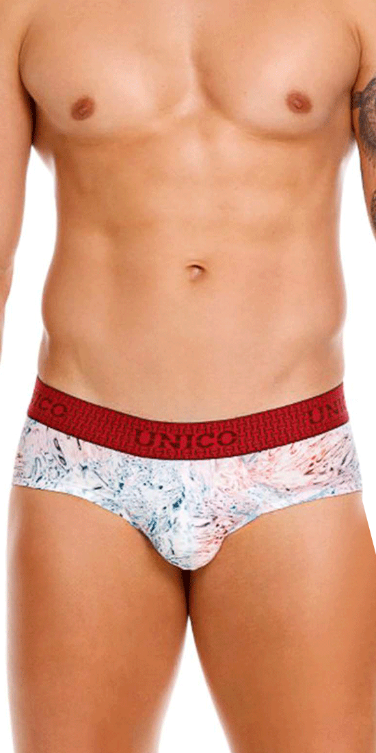 These men's briefs from ÚNICO showcase a vibrant abstract print in shades of white, blue, and red, creating a modern and artistic look. The red elastic waistband with the brand’s name in a subtle repeating pattern adds a bold contrast. Crafted from high-quality, breathable fabric, these briefs provide optimal comfort and support for all-day wear.
